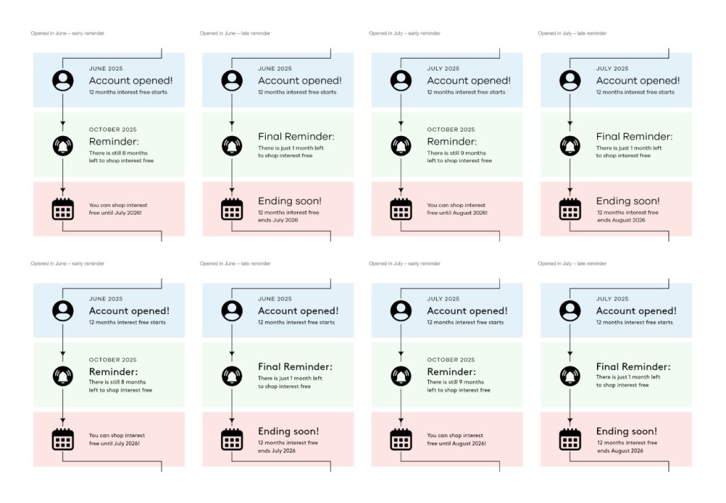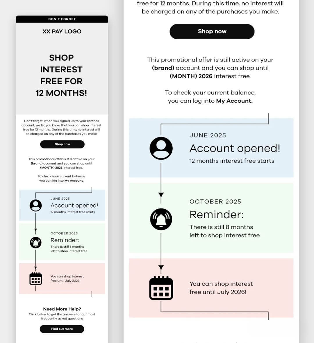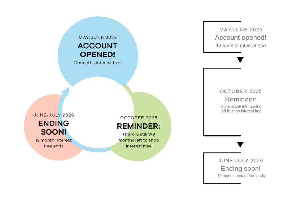 The brief: Create a graphical reminder for customers who have signed up for a 12-month interest-free credit account. The primary requirement is to help customers track their 12-month journey from account opening to the expiry deadline ensuring they stay informed and avoid unexpected interest charges.